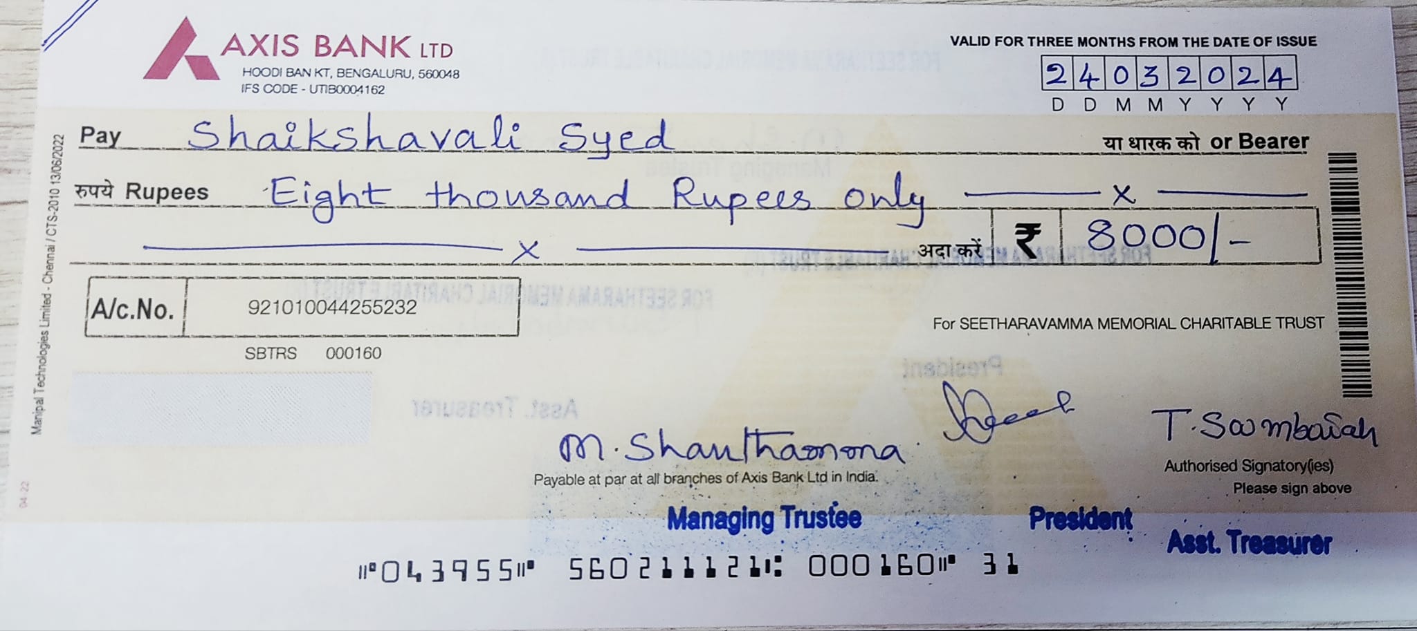 SEETHARAVAMMA MEMORIAL CHARITABLE TRUST extended Financial support to a needy Meritorious, talented student Kumari. Meenakshi for her 10 th std fees purpose.Kumari.Meenakshi currently studying in Lincoln English memorial school in Anekal, Karnataka state.Today On-behalf of our trust Mr. Manoj (Sponsor) and Mr. Arun (Joint secretary of our trust ) handed over the cheque amount 10000 rs to Kumari. Meenakshi at Anekal.Seetharavamma Memorial Charitable Trust express our gratitude to Mr.Manoj for his quick response and valuable Contribution.On behalf of Seetharavamma Memorial Charitable Trust We wish Kumari. Meenakshi all success and a great future. Thank you all.
